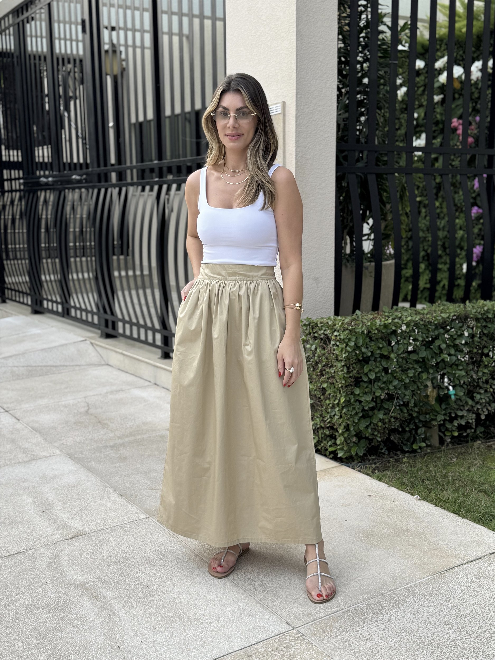 Saia Havanna, é feita de tecido 100% algodão de alta gramatura, oferecendo um caimento estruturado e elegante. Com comprimento midi e cós largo que define a cintura, possui um zíper invisível para acabamento impecável. A modelagem rodada e franzida na cintura confere um toque clássico e feminino, com bolsos que adicionam praticidade.